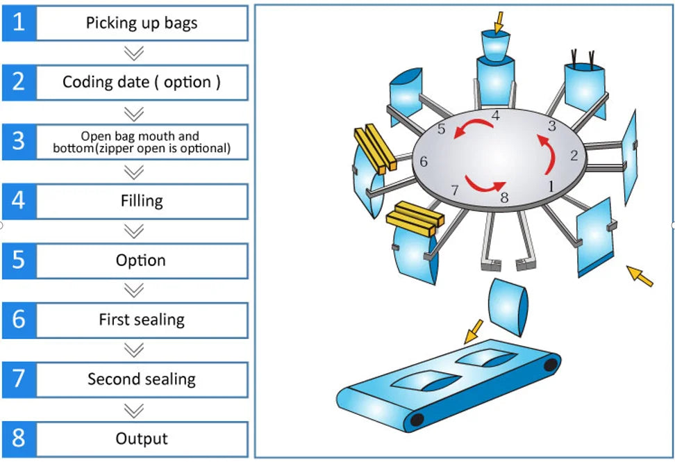 (1)Bags magazine→holding and opening→date printing→products filling→magazine the products inside bag→sealingConsidering different