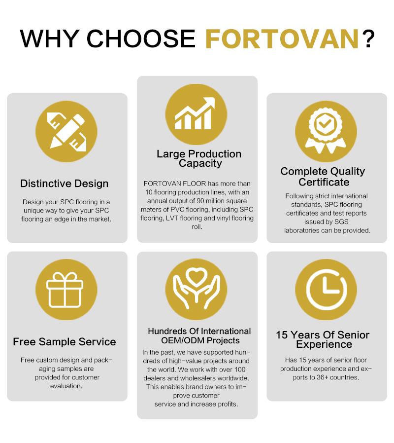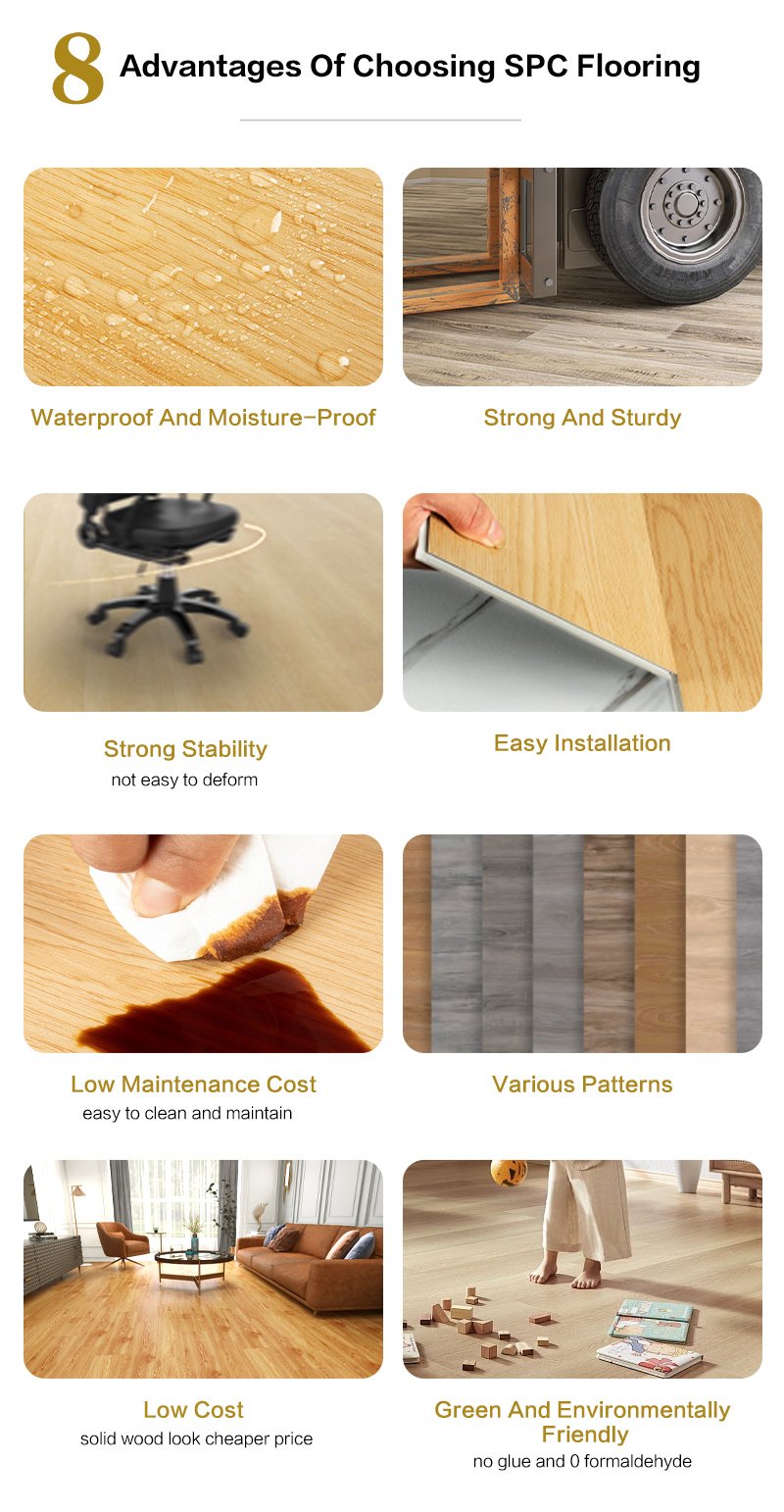 The SPC flooring is mainly a kind of natural limestone, Polyvinyl chloride and stabilizer which combined by a certain ratio to provide us with very stable composite materials. The SPC flooring uses rigid core to break away from the super core of luxury ethylene bubble. Stone plastic composite materials make the core layer almost indestructible, and it can be kept in shape even on uneven flooring.