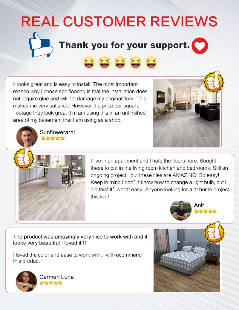 A:(1) First look at the appearance of the SPC floor (hard core-ring base floor): a good SPC floor has a smooth surface, no pollution and scratches, no obvious pigmentation, clear patterns, and no damage;