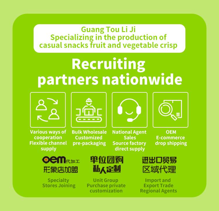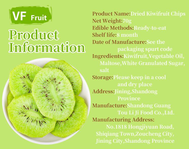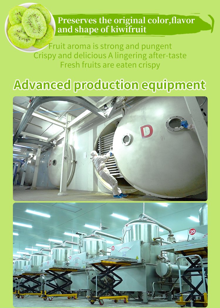 2.The kiwifruit crisp made by VF process,Vacuum frying is a frying process at low temperature and low pressure.In the process of vacuum frying,the ingredients are placed under reduced pressure,and the purpose of frying is achieved by quickly removing moisture at a lower temperature(65-100℃).