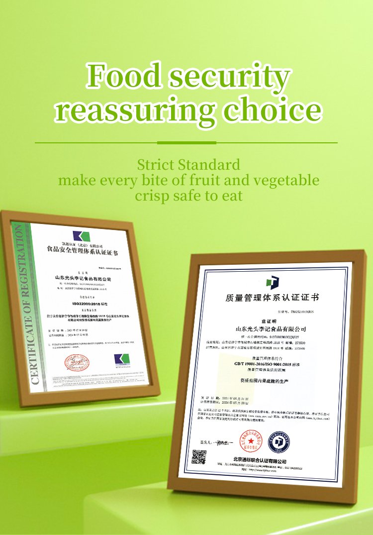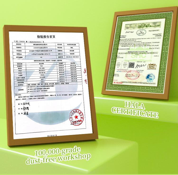 Obtained ISO22000 , ISO 9001 and HALA certification ,and the daily real in accordance with the standard to implement, with foreign trade export record qualification, export and domestic sales to ensure the same quality and requirements.
