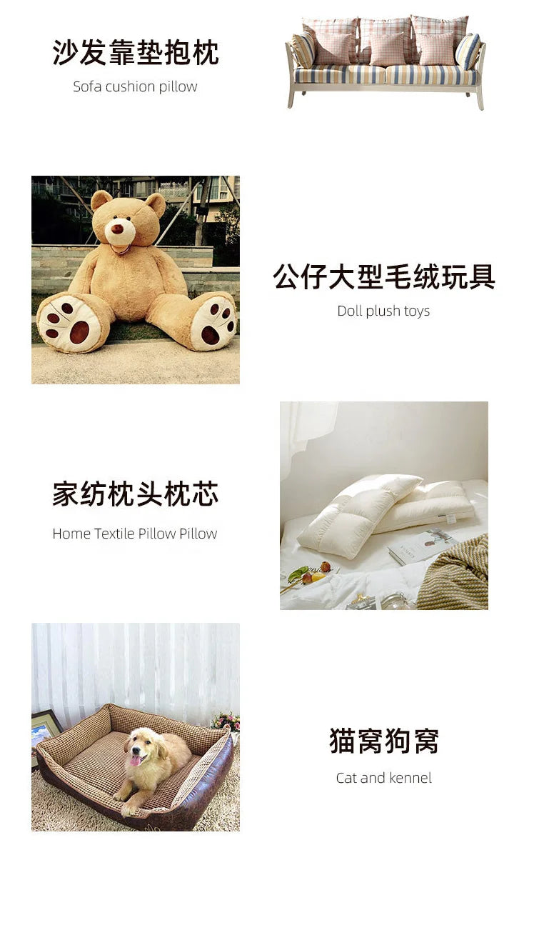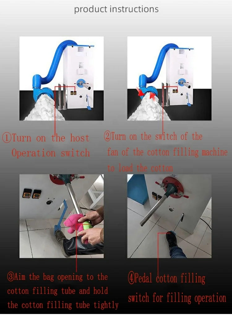 Cotton filling machine, also known as filling machine, cotton flushing machine. The filling efficiency is 15-20 times that of handwork. It can be filled with long and short fibers, 0.7D-15D cotton, PP cotton, leftovers, plastic particles and foam particles, Joe Mai, etc., making cloth toys, sofas, cushions, cushions and beds The products are more fluffy, soft and elastic,and feel comfortable.