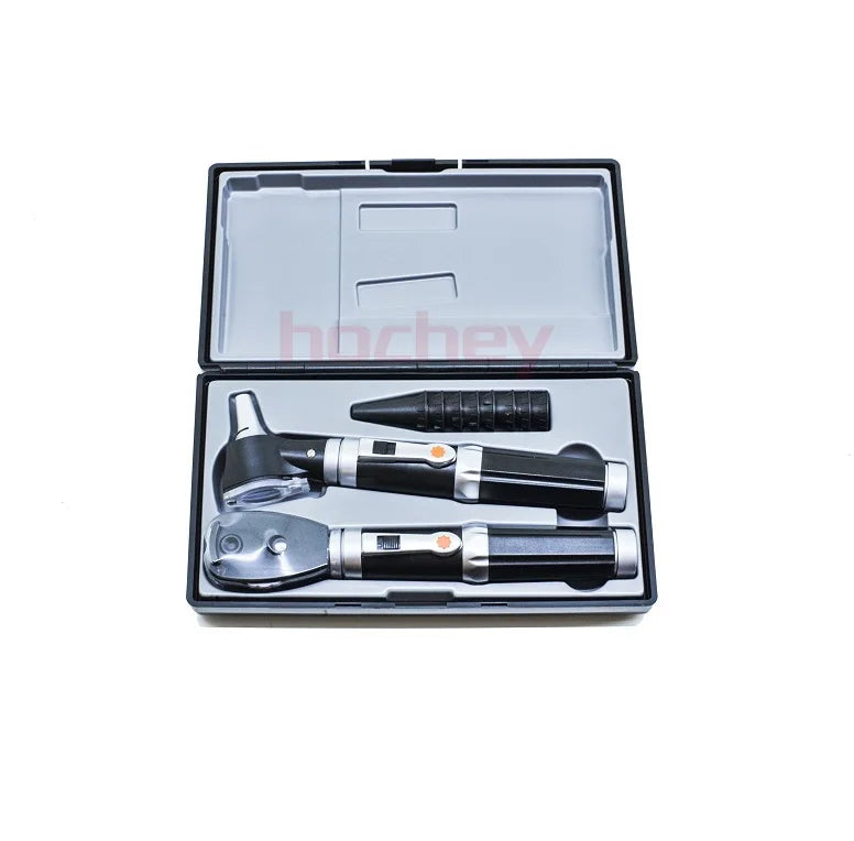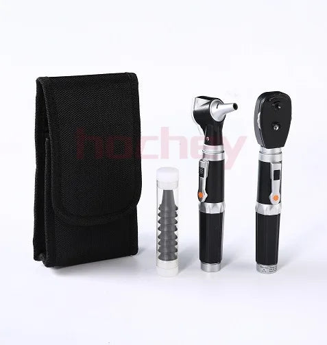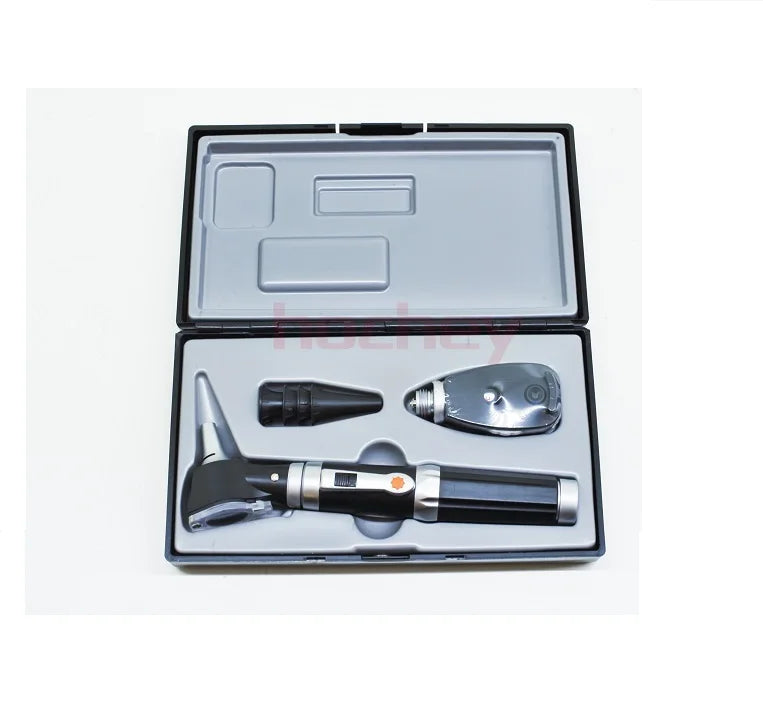 Simple handle, a head of fiber optic otoscope, a head of direct ophthalmoscope, ear tips.