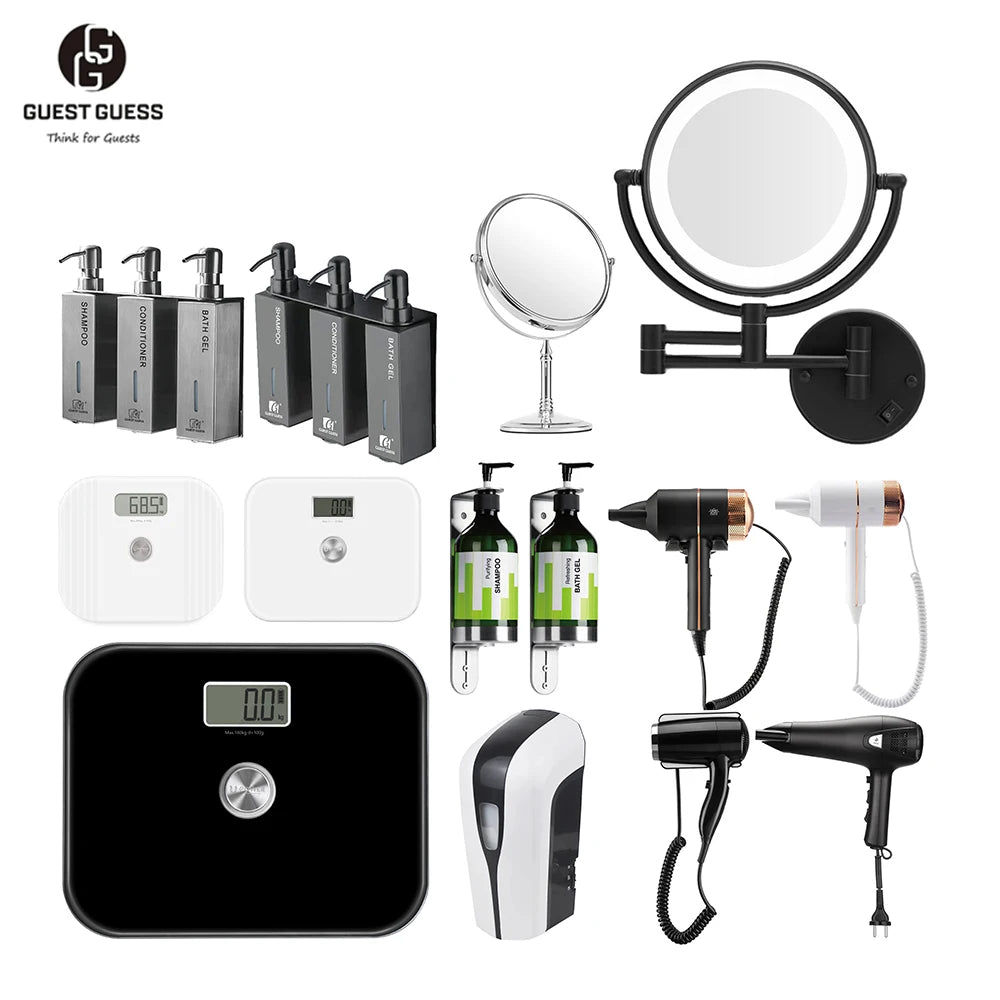 Hotel make-up mirror, Hotel soap dispenser, Hotel hair dryer etc