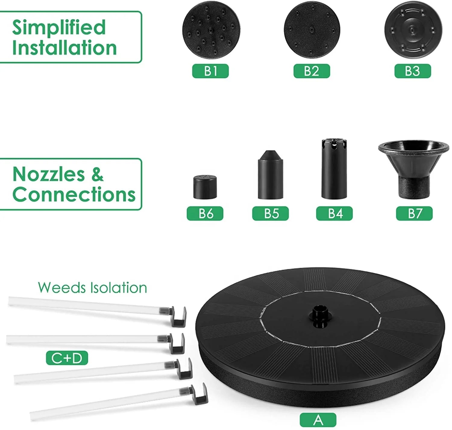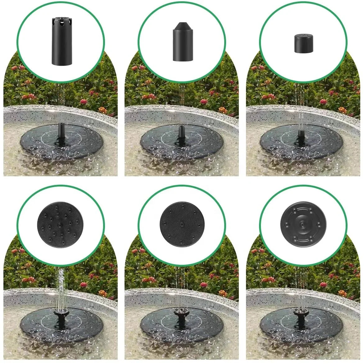 8 Solar water fountain comes with 7 spray head in different spray pattern, choose any one spray water pattern you like.
