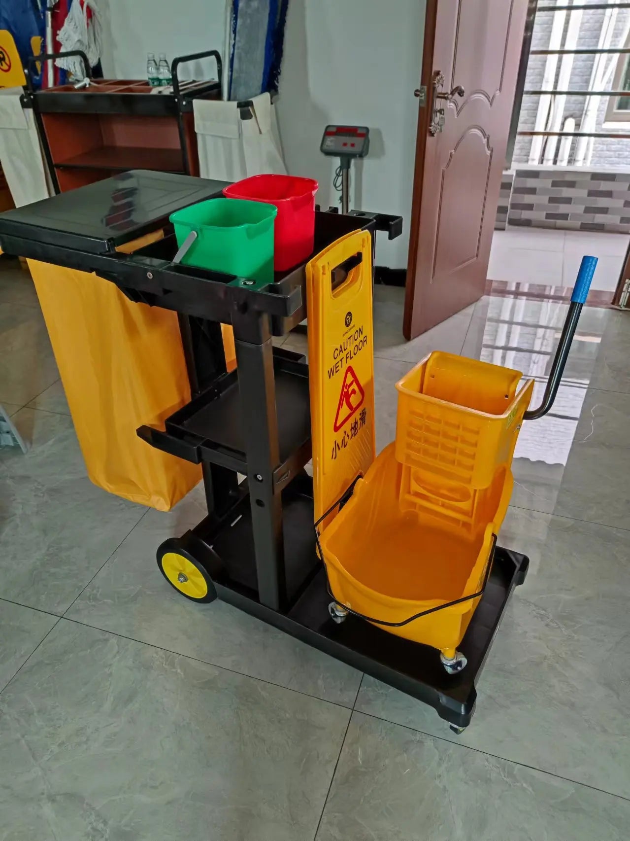 It can water loading,Mop squeezing water,the dispatch of hotel roomsdaily supplies,Loading rubbish and hanging different mops.